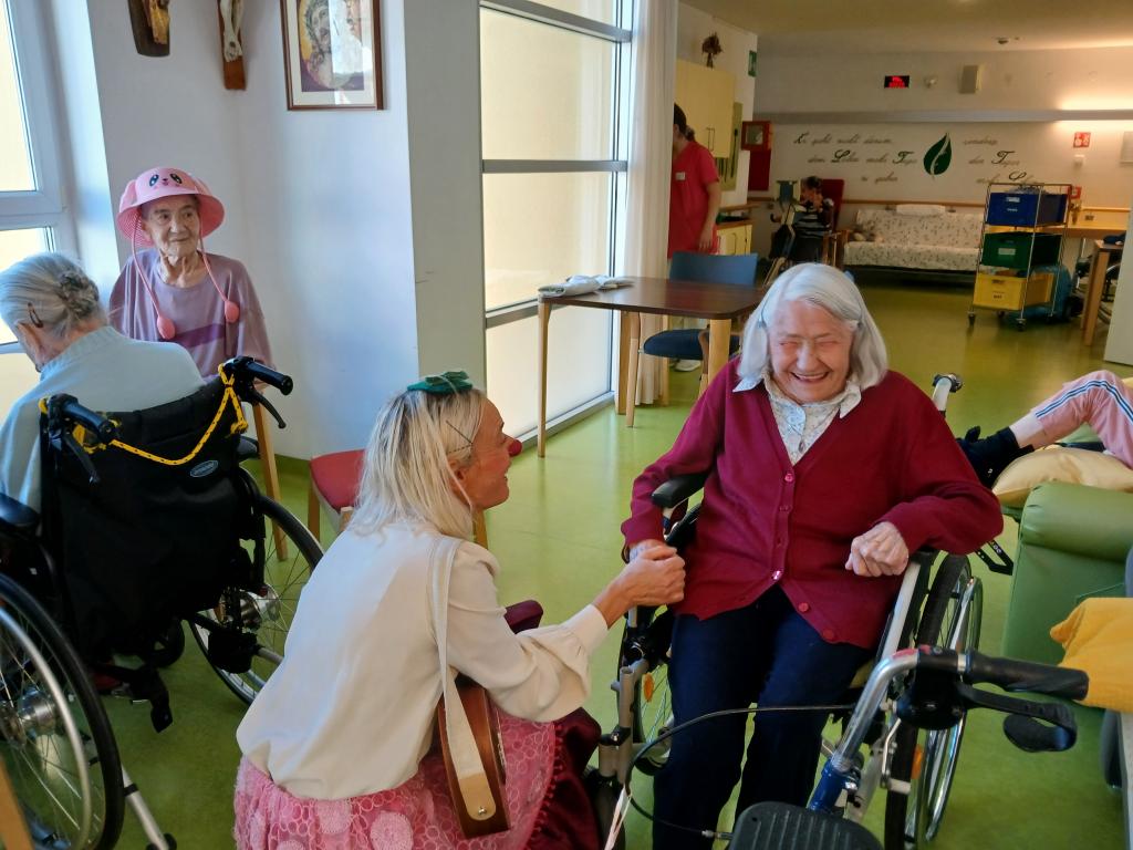 Doch auch als Clown zeigt sich die Professionalität; die beiden Künstlerinnen verstanden es meisterhaft, auf ihre Zuschauer einzugehen. Ob mit kleinen Zaubertricks, Scherzen, Liedern oder einfach einem freundlichen Blick – sie zauberten selbst den ruhigsten Bewohnerinnen und Bewohnern ein Lächeln ins Gesicht. Auch das Pflegepersonal zeigte sich begeistert: eifrig wurde viele lustige Momente abgeknipst, zum mitmachen animiert und fleißig mitgesungen.
