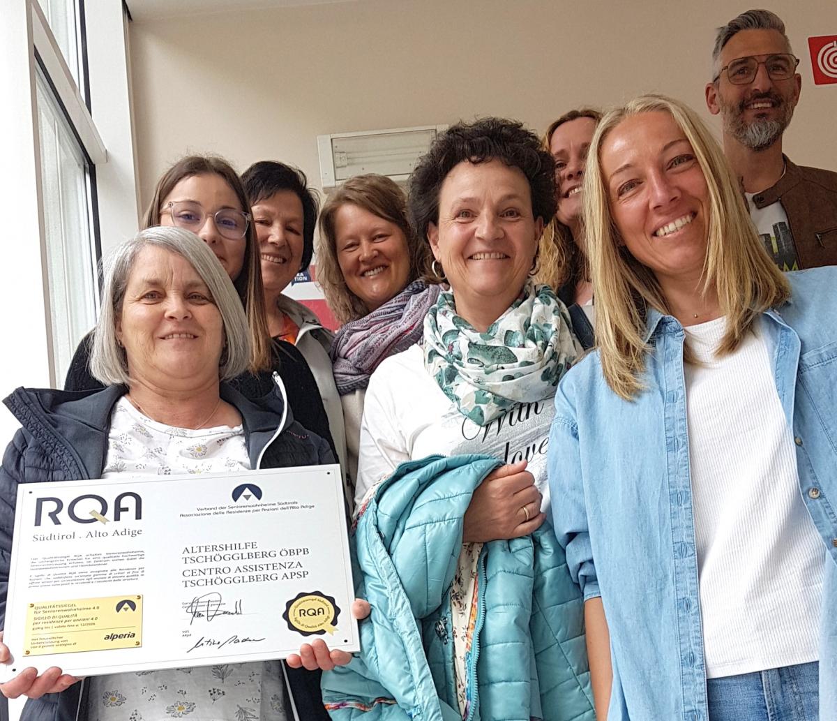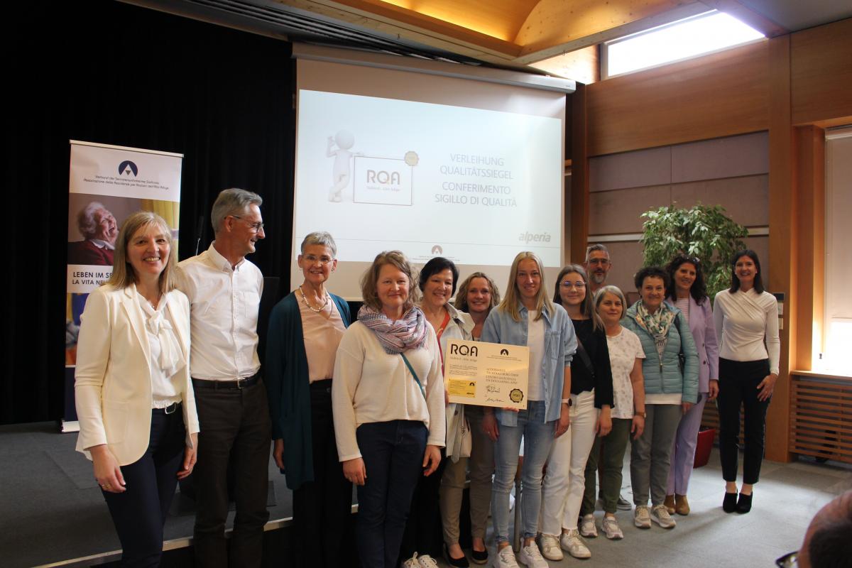In occasione dell'Assemblea Generale dell'Associazione delle Case di Riposo dell'Alto Adige del 17 aprile 2024, l'APSP Centro Assistenza Tschögglberg è stata insignita del sigillo di qualità RQA per la ricertificazione.