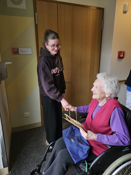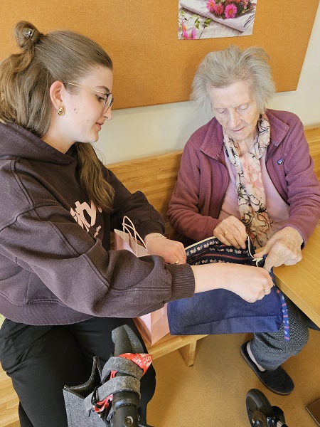Darüber hinaus setzte sie im Rahmen eines weiteren Praktikums in der Schneiderei Schneider & Sticker in Kastelbell ein besonderes Projekt um: Sie fertigte liebevoll gestaltete Taschen für die Heimbewohner an. Diese Taschen zeichnen sich durch ein individuelles Innenleben und die gestickten Namen der Heimbewohner aus. Sie können praktisch für Rollatoren, Rollstühle und zur Aufbewahrung persönlicher Gegenstände im Zimmer genutzt werden. Damit sind nützliche Dinge des Alltags – sei es die Sonnenbrille für den Ausflug oder die Strickwolle – jederzeit schnell zur Hand.